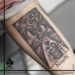 The client, an avid traveller, wanted to remember his journey from a tourist to a traveller. From preparing to wandering. So we did a brainstorming, which led me to draw a sketch of his ideas on paper and then transfer it into ink on his skin. This is a tribute to all the walks taken in the starry night, among the mountains, with the sky as the ultimate guide.