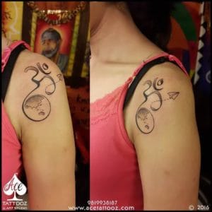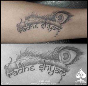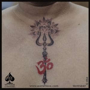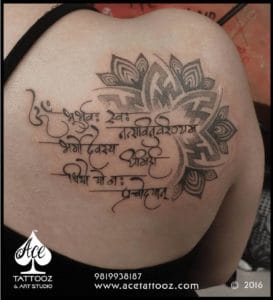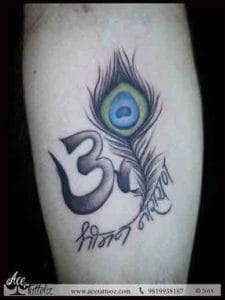 It is a rather religious tattoo which depicts the peacock feather being attached to the symbol “Om” which means that it is a perfect representation of Lord Krishna. The text at the bottom says “Shrimaan Narayan” which is the mantra of Lord Vishnu. This is the best god tattoo designs inked at Ace Tattooz & Art Studio.