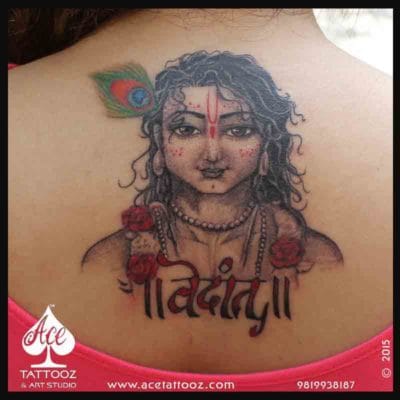 Created this tattoo for a very known Make-up Artist Rajani Sosa. Her Imagination for Lord Krishna is Young; Charming & Flamboyant along with her songs name ie Vedant. She was very happy for the tattoo.