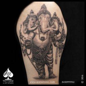 This is one of the best works in our lord Ganesha tattoo gallery. It took 7 hrs Approx to pull this amazingly detailed piece and the client was amazed by the outcome done by our Ace Artist: Kshitij Gurav